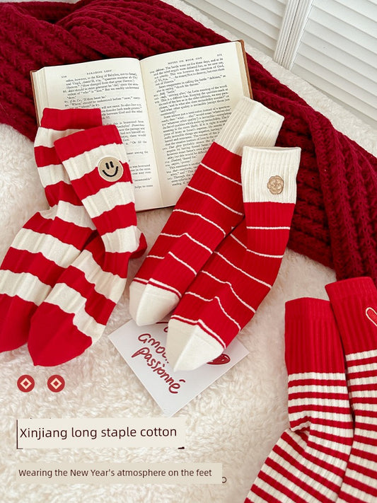 Red Socks for Women New Year 2025 Dragon Year Tube Socks Fall and Winter Heattech Birth Year Wedding Couple Pure Cotton Antibacterial Socks